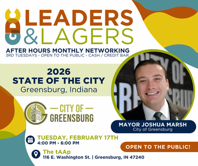 Mayor Joshua Marsh will join us as the guest speaker for February Leaders & Lagers after-hours networking event. He will review 2025 and share insights into what lies ahead for the City of Greensburg, Indiana, in 2026!